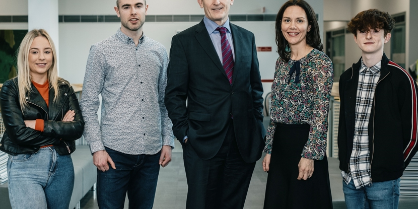 The Choice Scholarship recipients 2019 – Katie Boyd, Michael Cassidy and Callum Edwards with Lawrence Jackson, Group Director of Corporate Services, Choice Housing and Karen Delgado, Head of Corporate Engagement, Ulster University (image taken before the pandemic)