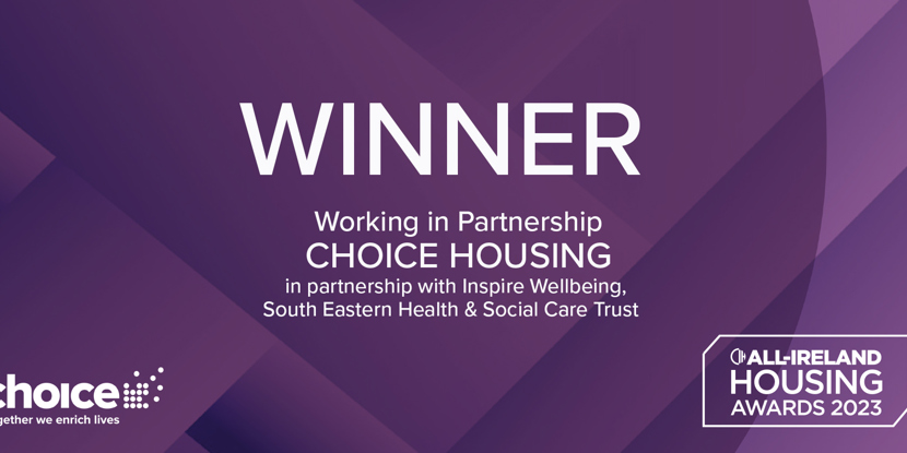 This CIH All Ireland Housing award commends collaborations that achieves the best possible outcomes. Choice has been recognised for working collaboratively to improve service delivery in order to benefit the people who use our services. As the overall winner Choice demonstrated evidence in good practice, managing partnerships, and establishing new ways of working.