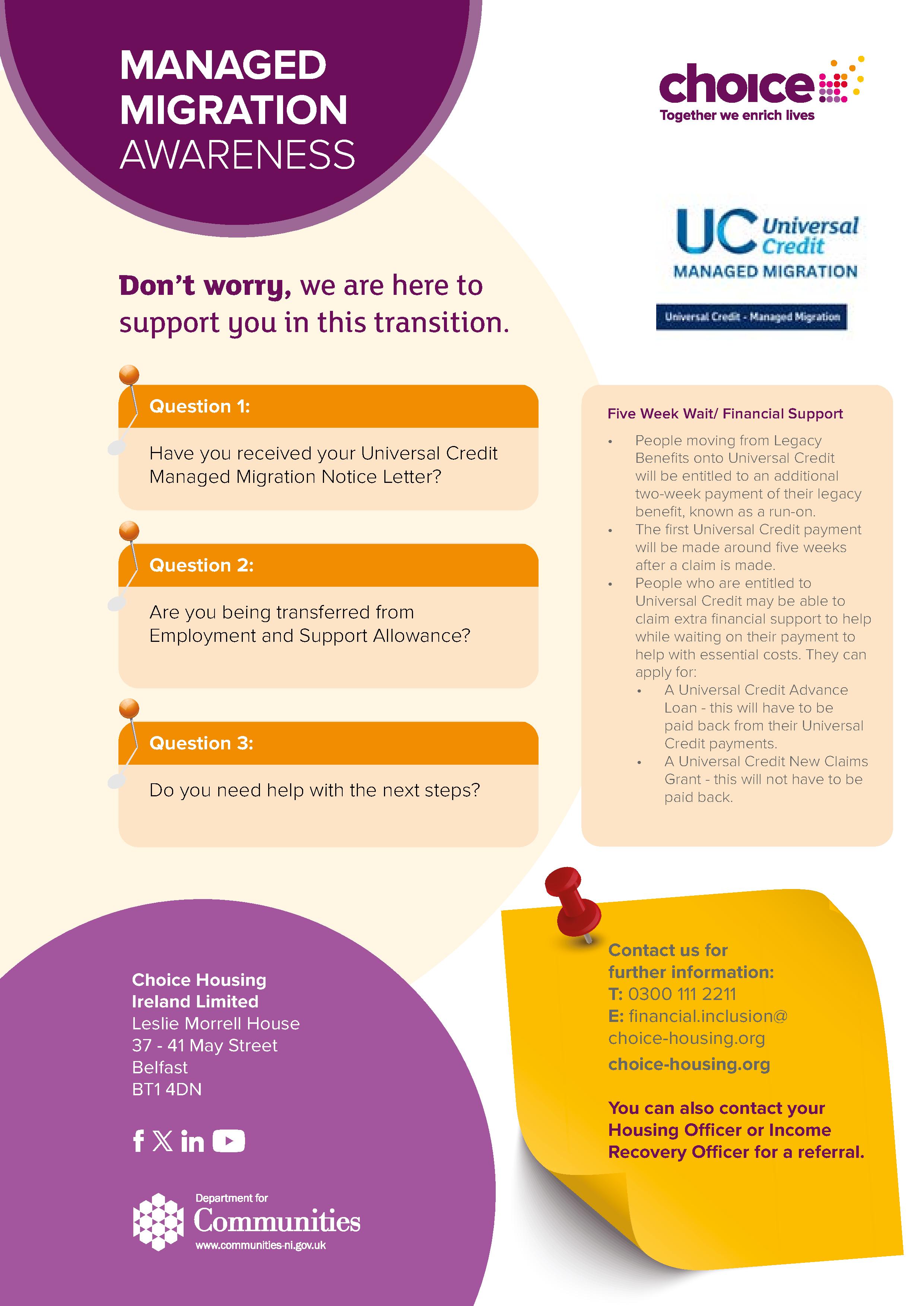 Don’t forget our Financial Inclusion Team are available for practical advice about money issues. You can contact them on 0300 111 2211 or email enquiries@choice-housing.org