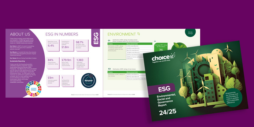 Choice has published our Environmental, Social and Governance (ESG) Report for 2024/25. This report, measured against the Social Housing Sector Sustainability and Reporting Standard (SRS), sets out our commitments and progress in a range of areas, including achieving zero, housing affordability, safety and tenant voice. Our ESG Report demonstrates our ongoing dedication to supporting thriving, sustainable communities while creating long term value for all our stakeholders.
